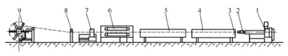 Actualmente, los tubos de PVC y PO son los productos de mayor volumen tanto a nivel nacional como internacional.Figura 1muestra el diagrama de flujo del proceso de producción de tuberías de poliolefina (PO). El plástico se introduce en la matriz anular (2) mediante el tornillo como una masa fundida uniformemente plastificada, extruyendo un parisón de tubería. Este ingresa inmediatamente a la unidad de calibración (3) para su enfriamiento y dimensionamiento, luego se enfría lo suficiente en el tanque de enfriamiento (4). El tubo se extrae a una velocidad constante mediante el ajustableunidad de transporte(6)y finalmente cortar a las longitudes especificadas con el cortador (7). Los tubos de paredes delgadas con diámetros inferiores a 160 mm se pueden enrollar en rollos mediante la bobinadora (9).