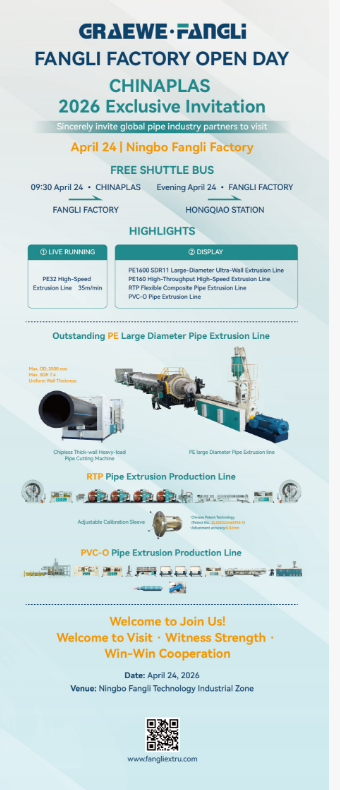 Del 21 al 24 de abril en CHINAPLAS 2026, visite Fangli Technology en el stand 7.1C14. ¡Exploremos juntos la innovación y la cooperación futura en equipos de tuberías de plástico!